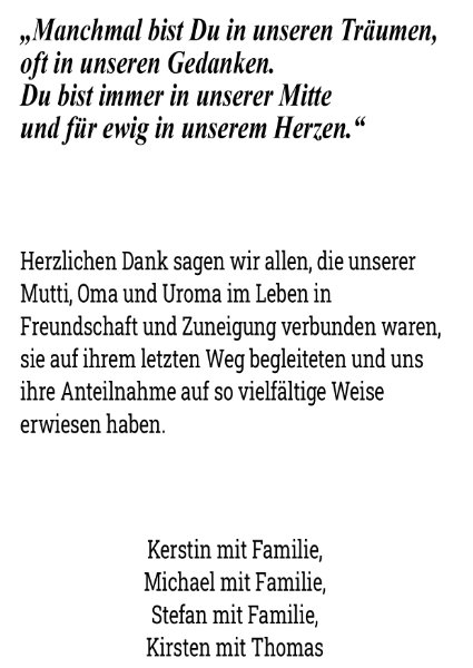 Liebe Mami, heute vor 2 Jahren hast Du unsere Herzen weinen lassen . Du hast uns in den Himmel verlassen . Wir wollten Dir , als unsere beste Mama auf der ganzen Welt noch vieles zeigen . Dank Dir haben wir vieles erreichen können. Du und wir zusammen haben öfters kämpfen müssen. Haben aber immer Dank Dir den Platz als Sieger und Herz der Herzen verlassen können. Du hast uns Kinder groß gezogen . Du hast Dich für uns geopfert und Du hast uns immer den Weg gezeigt ins Glück und zum Erfolg ! Mama ich und meine Familie vermissen Dich so sehr . Ich hoffe Dir geht es gut bei Jesus im Himmel. Du bist oft bei uns ! Jeder Regenbogen schlägt die Brücke in unsere Herzen ! Alle Erinnerungen an die schönen Stunden, Tage, Wochen, Monate, Jahre werden wach in uns . Wir wünschen Dir nur das Beste . Eines Tages werden wir uns hoffentlich alle miteinander vereinigt wiedersehen und uns in die Arme nehmen und uns viel zu erzählen haben . Dein Sohn Michael plus Familie